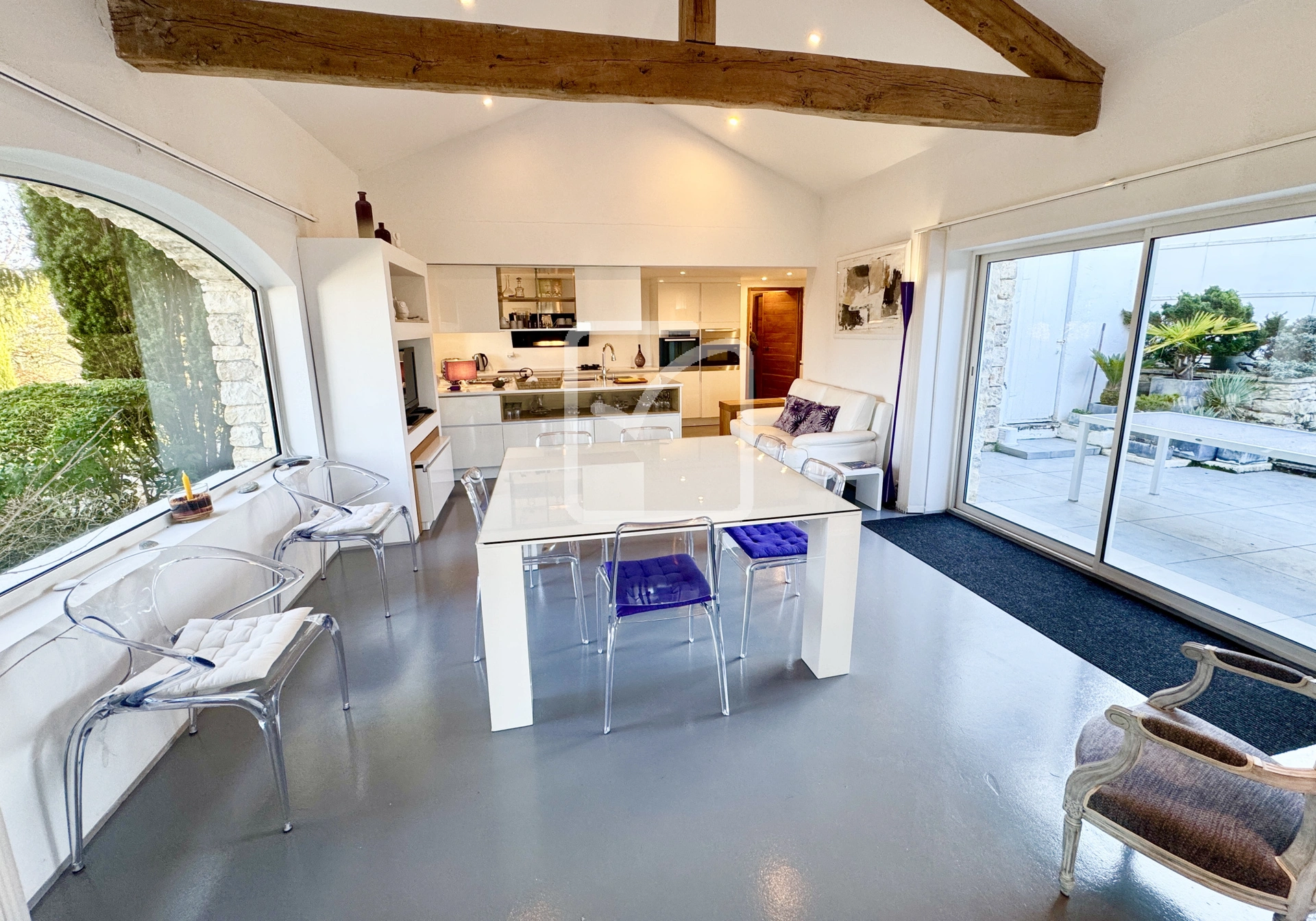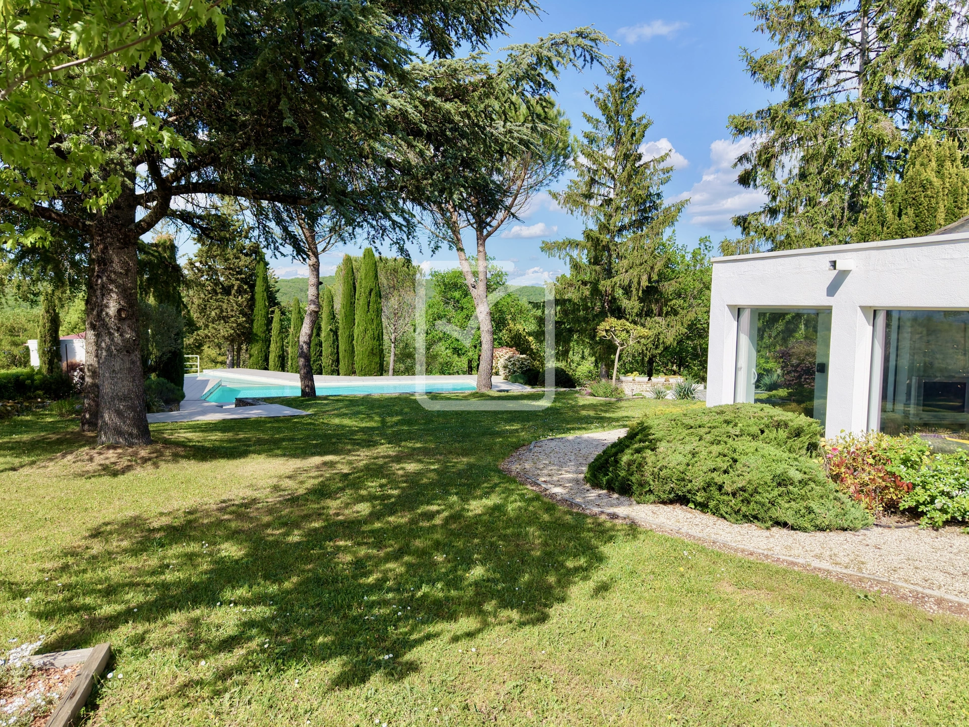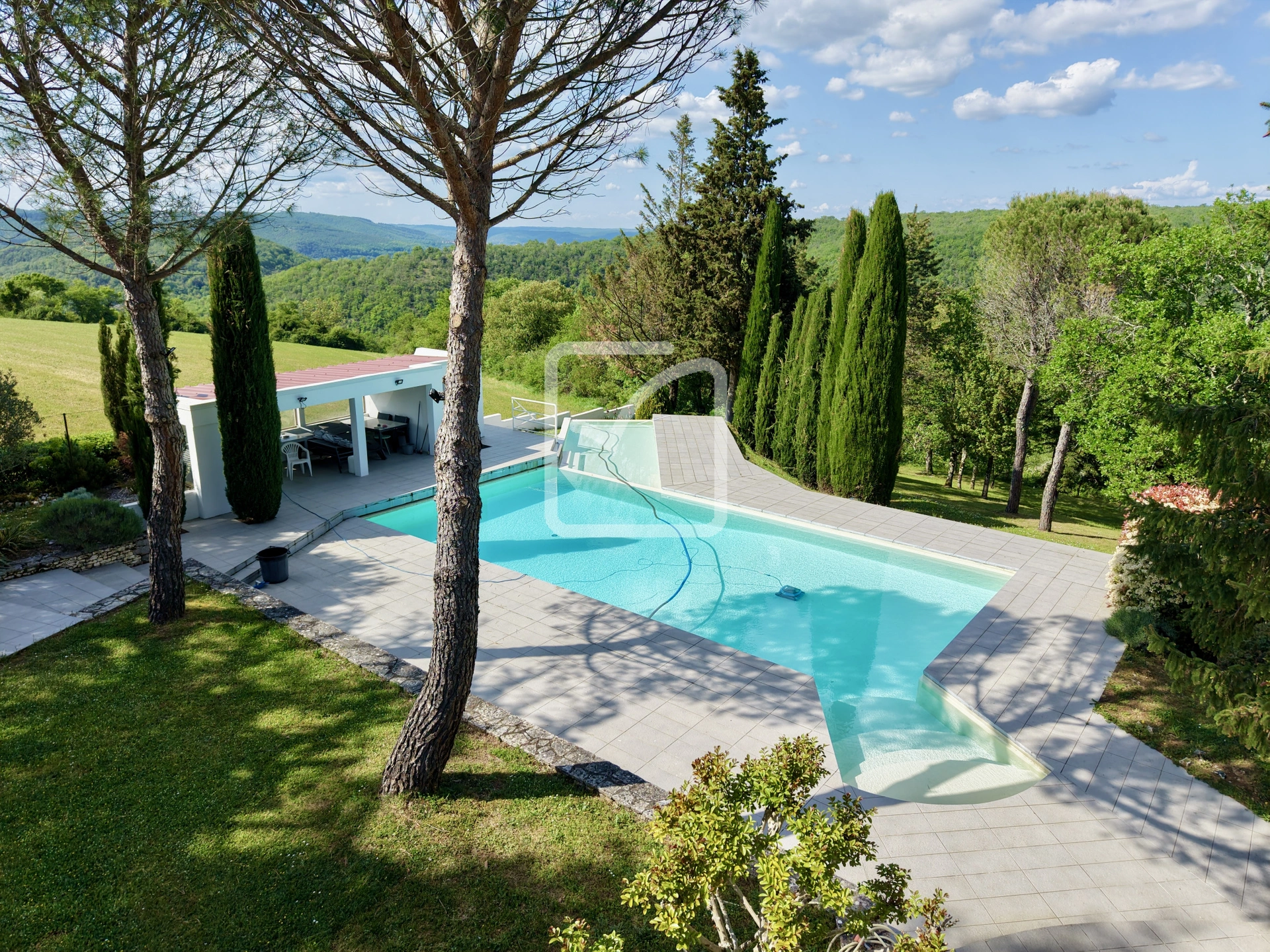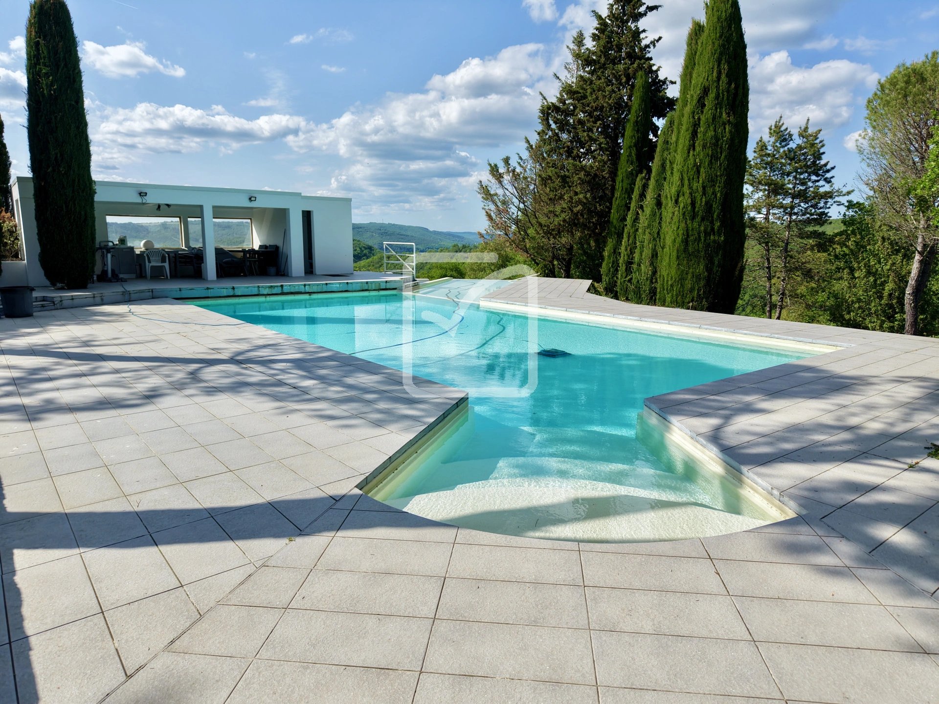 À l'extérieur, le parc paysager devient un véritable décor de carte postale. La piscine à double bassin à débordement s'inscrit dans le paysage comme une évidence, offrant une vue imprenable sur les reliefs environnants. Le poolhouse, pensé comme un lieu de vie à part entière, accueille repas et instants de partage, prolongés par de vastes plages propices aux réceptions comme aux moments suspendus. Une longue dépendance offre un potentiel supplémentaire.