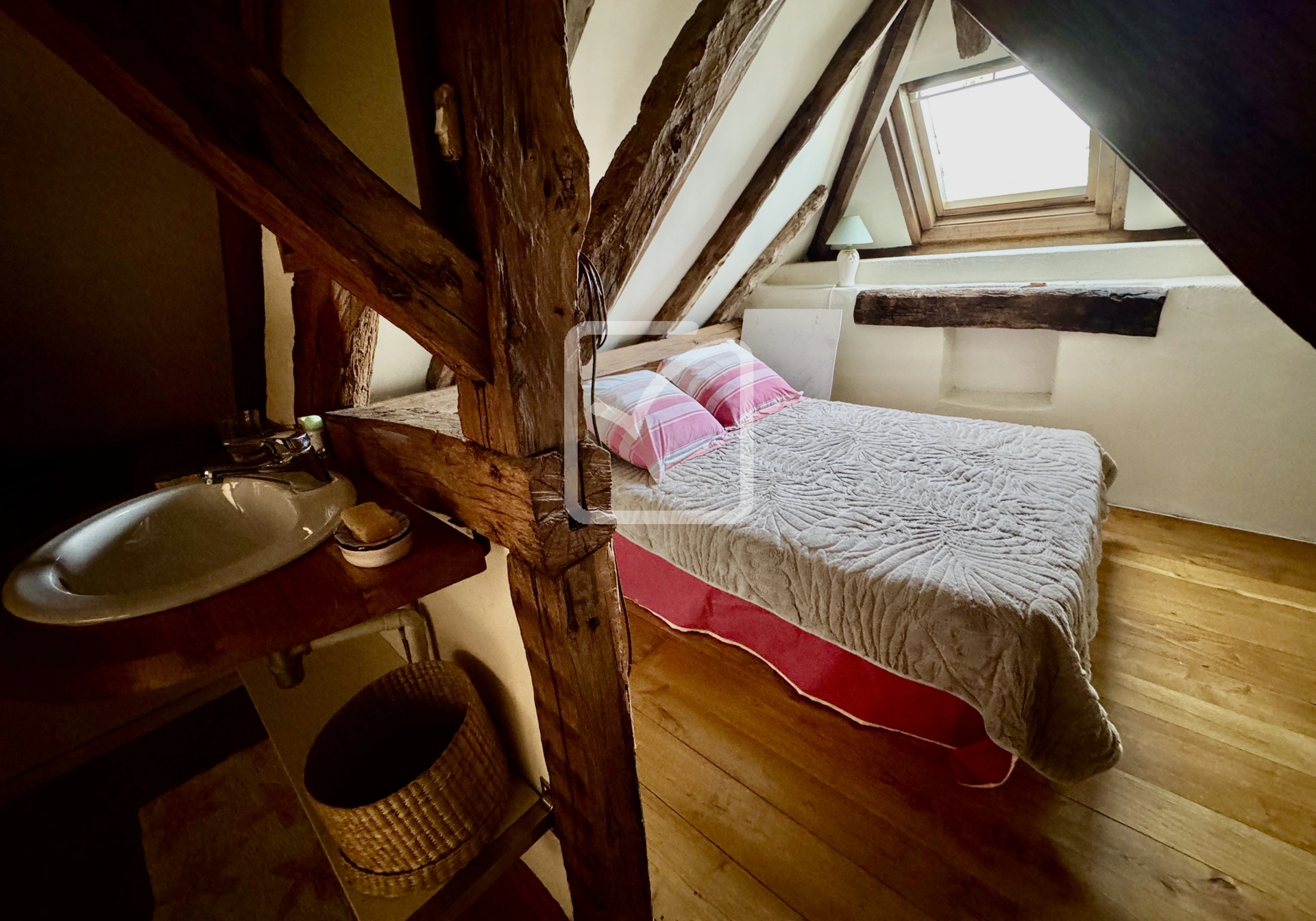 La première bâtisse, ancienne grange sublimée par une rénovation de caractère, déploie un volume de vie spectaculaire de 70 m2 baigné de lumière. Sa mezzanine aérienne prolonge l'espace avec subtilité, idéale pour un bureau ou un salon intimiste. À l'étage, trois chambres accueillantes, dont deux avec salles d'eau privatives, offrent un confort raffiné, renforcé par un équipement complet : plancher chauffant, insert et pompe à chaleur.
