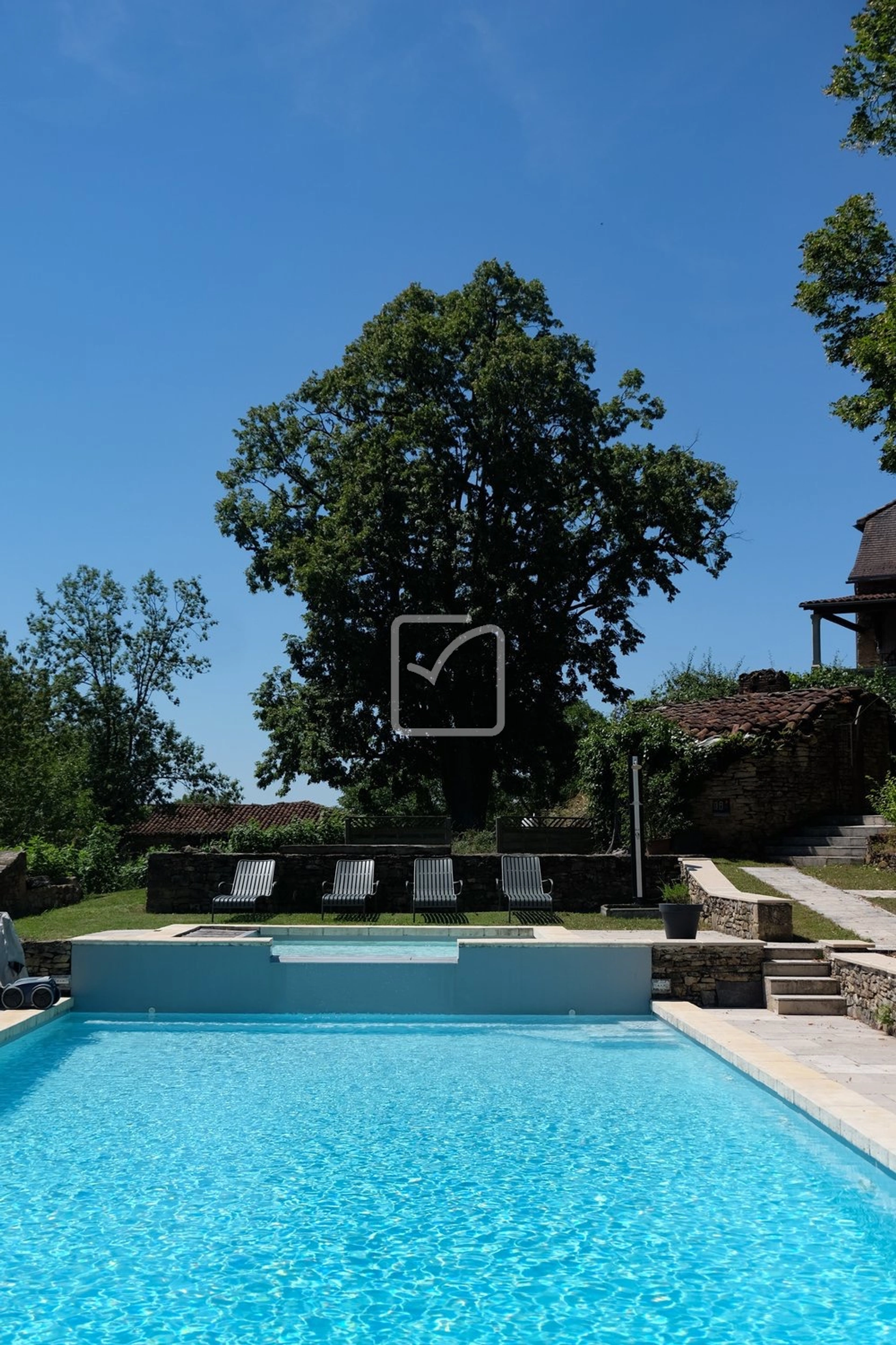 Piscine : Grande piscine à débordement traitée au sel, automatisée et sécurisée, avec alimentation en eau par puits, offrant une autonomie en période estivale